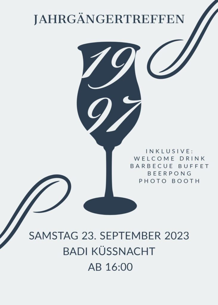 Es freut üs sehr, dass mier nach 10 Jahr chönd zäme fiire und alti Erinnerige uflebe lah. Mitem Ihzahle vom Bitrag vo 60 Franke bisch agmeldet. 🥳 Mit debi isch en welcome Drink, Snacks und zum Znacht es mega Barbecue. Au für en Photo Booth und Beerpong Equipment isch gsorgt, also es lohnt sich und mier freued üs scho jetzt uf üch!